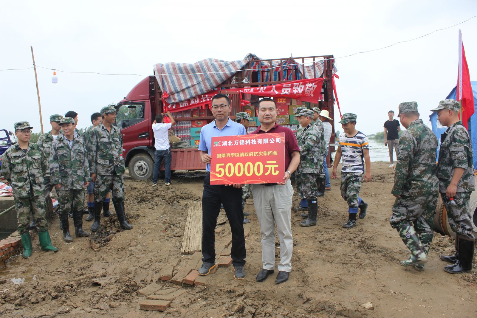 2020年6月入梅以來,湖北省持續(xù)出現(xiàn)了多輪強降雨,我省第三大湖泊長湖水域持續(xù)超保證水位,一旦滿堤潰壩,將會嚴(yán)重威脅荊州、沙洋、潛江三縣市850萬人口,18000平方公里國土面積的安全。為保障廣大人民群眾的生命財產(chǎn)安全,防汛搶險人員和武警部隊已經(jīng)堅守長湖抗洪前線一個多月。2020年7月14日,湖北萬錦科技有限公司秉承企業(yè)社會責(zé)任,董事長夏祥義同志率公司員工親臨抗洪前線,慰問堅守一線的抗洪搶險人員。分別向受災(zāi)嚴(yán)重的沙洋縣后港鎮(zhèn)、毛李鎮(zhèn)捐贈10萬元防汛抗災(zāi)慰問金、300件礦泉水和300箱方便面,感謝他們?yōu)楣靶l(wèi)荊楚、保衛(wèi)湖北做出的巨大貢獻。