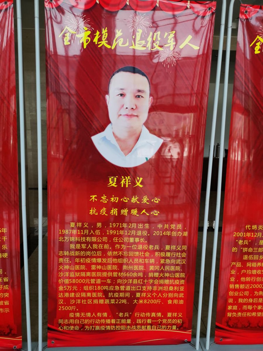 抗疫捐贈暖人心,不忘初心獻愛心——湖北萬錦科技有限公司董事長夏祥義獲得荊門市模范退役軍人榮譽稱號,作為模范軍人代表作了《使命,在責任與擔當中升華》的發(fā)言。
