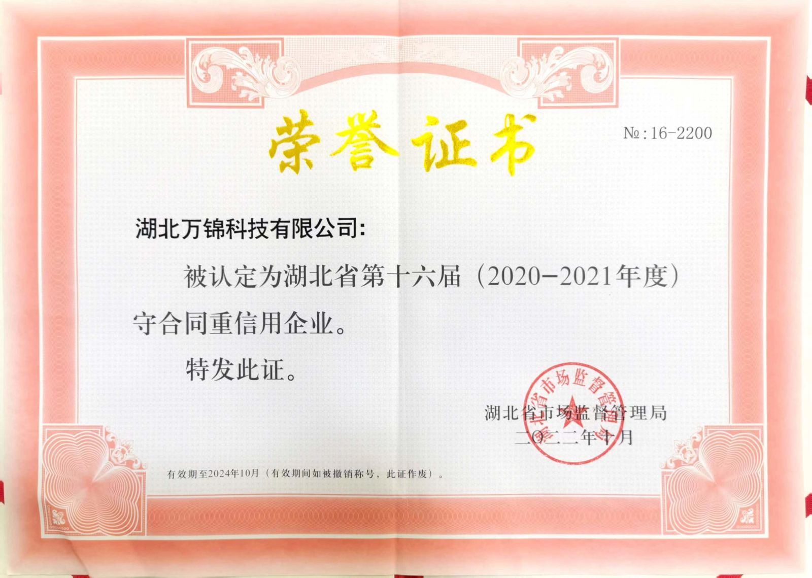 11月25日,湖北萬錦科技有限公司憑借良好的經(jīng)營(yíng)作風(fēng)、優(yōu)質(zhì)的服務(wù)水平和規(guī)范的經(jīng)營(yíng)管理,獲得了湖北省第十六屆(2020-2021年度)“守合同重信用企業(yè)”榮譽(yù)。