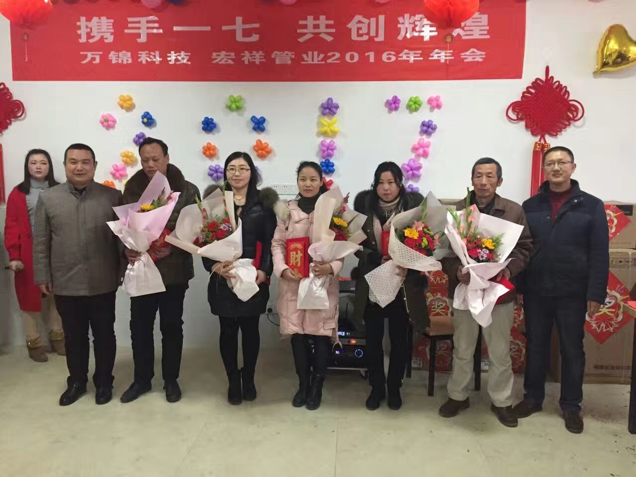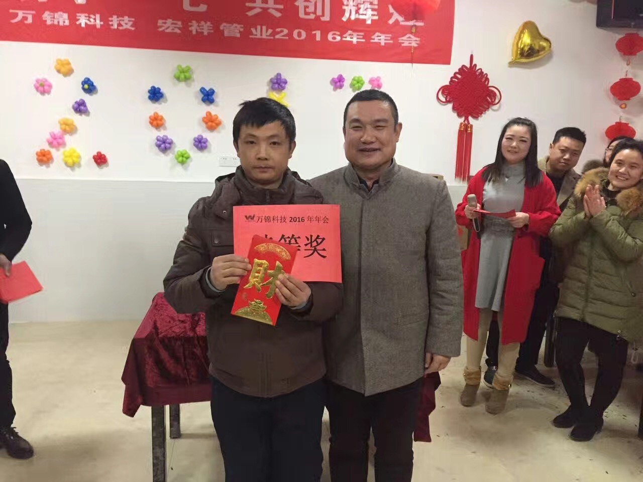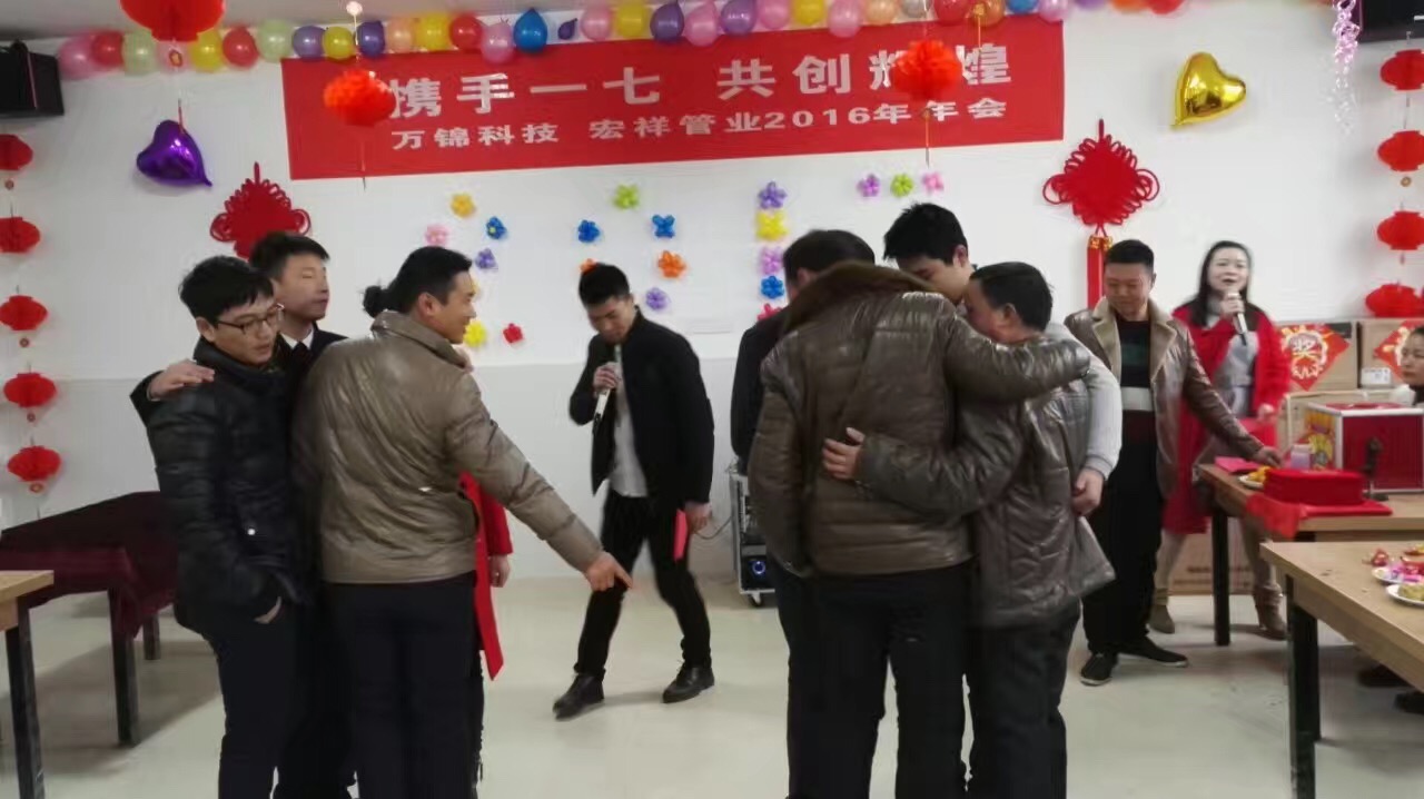 2017年1月18日,萬錦科技舉辦了“攜手一七 共創(chuàng)輝”2016年聯(lián)歡晚會(huì),晚會(huì)開始前,兩位主持人組織到場(chǎng)人員進(jìn)行了各項(xiàng)小游戲,并對(duì)優(yōu)勝者頒發(fā)了歡樂獎(jiǎng);晚會(huì)第二項(xiàng)由公司副總經(jīng)理、財(cái)務(wù)總監(jiān)饒林香女士宣布了2016年度生產(chǎn)標(biāo)兵和優(yōu)秀員工,集團(tuán)副總吳國(guó)安先生為生產(chǎn)標(biāo)兵的優(yōu)秀員工頒發(fā)了榮譽(yù)證書,集團(tuán)董事長(zhǎng)夏祥義先生為生產(chǎn)標(biāo)兵和優(yōu)秀員工頒發(fā)了現(xiàn)金紅包獎(jiǎng);晚會(huì)第三項(xiàng)進(jìn)行了部門精英挑戰(zhàn)賽,依次由副總經(jīng)理、財(cái)務(wù)總監(jiān)饒林香女士;副總經(jīng)理、生產(chǎn)總監(jiān)張艷平;宏祥管業(yè)生產(chǎn)總監(jiān)陶建明;營(yíng)銷總監(jiān)高陽新代表四個(gè)部門進(jìn)行2017年工作任務(wù)表態(tài)發(fā)言;晚會(huì)第四項(xiàng)集團(tuán)董事長(zhǎng)夏祥義先生致辭;晚會(huì)第五項(xiàng)進(jìn)行了幸運(yùn)大抽獎(jiǎng),抽取了特等獎(jiǎng)1名,獎(jiǎng)品為現(xiàn)金2888元;1等獎(jiǎng)2名,獎(jiǎng)品為現(xiàn)金1888元;2等獎(jiǎng)3名,獎(jiǎng)品為小天鵝洗衣機(jī)1臺(tái);3等獎(jiǎng)10名,獎(jiǎng)品為美的微波爐1臺(tái);晚會(huì)第六項(xiàng)年會(huì)晚宴,晚宴結(jié)束后對(duì)到場(chǎng)人員進(jìn)行了新春禮品發(fā)放。