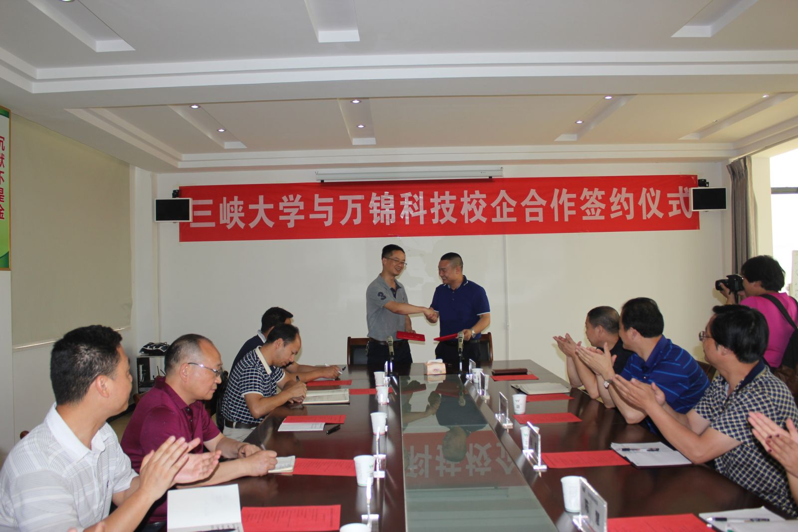 儀式開始前,董事長夏祥義、生產(chǎn)總監(jiān)張艷平、營銷總監(jiān)高陽新等公司負責(zé)人陪同三峽大學(xué)專家教授團視察了萬錦科技和宏祥管業(yè)。簽約儀式上夏總發(fā)表了熱情洋溢的致辭,向三峽大學(xué)專家教授團和縣領(lǐng)導(dǎo)表明了公司科技創(chuàng)新的決心。三峽大學(xué)材料與化工學(xué)院副院長楊學(xué)林博士與萬錦科技董事長夏祥義先生做代表在校企合作合同上進行了簽字。隨后三峽大學(xué)材料與化工學(xué)院副院長楊學(xué)林博士、李德江教授、楊進教授、沙洋縣科技局局長李旭同志發(fā)表了講話,最后沙洋縣政府副縣長李旭祥同志發(fā)表了講話并對此次校企合作提出了要求。